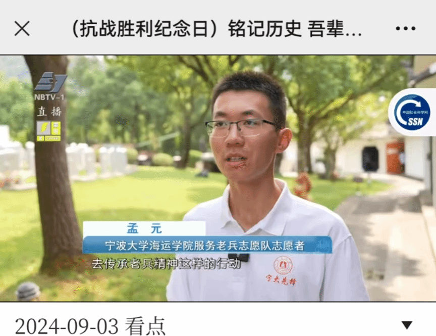 在主题纪念仪式结束后,日韩无码 师生怀着崇敬的心情,给为中国人民抗日战争和世界反法西斯战争做出壮烈牺牲和巨大贡献的革命烈士擦拭墓碑、献花、鞠躬、敬礼,向革命先烈致以最崇高的敬意。此外,日韩无码 服务老兵志愿队队长孟元同学接受宁波电视台采访,表达要铭记历史,弘扬和传承老兵精神,做好青年使命担当。