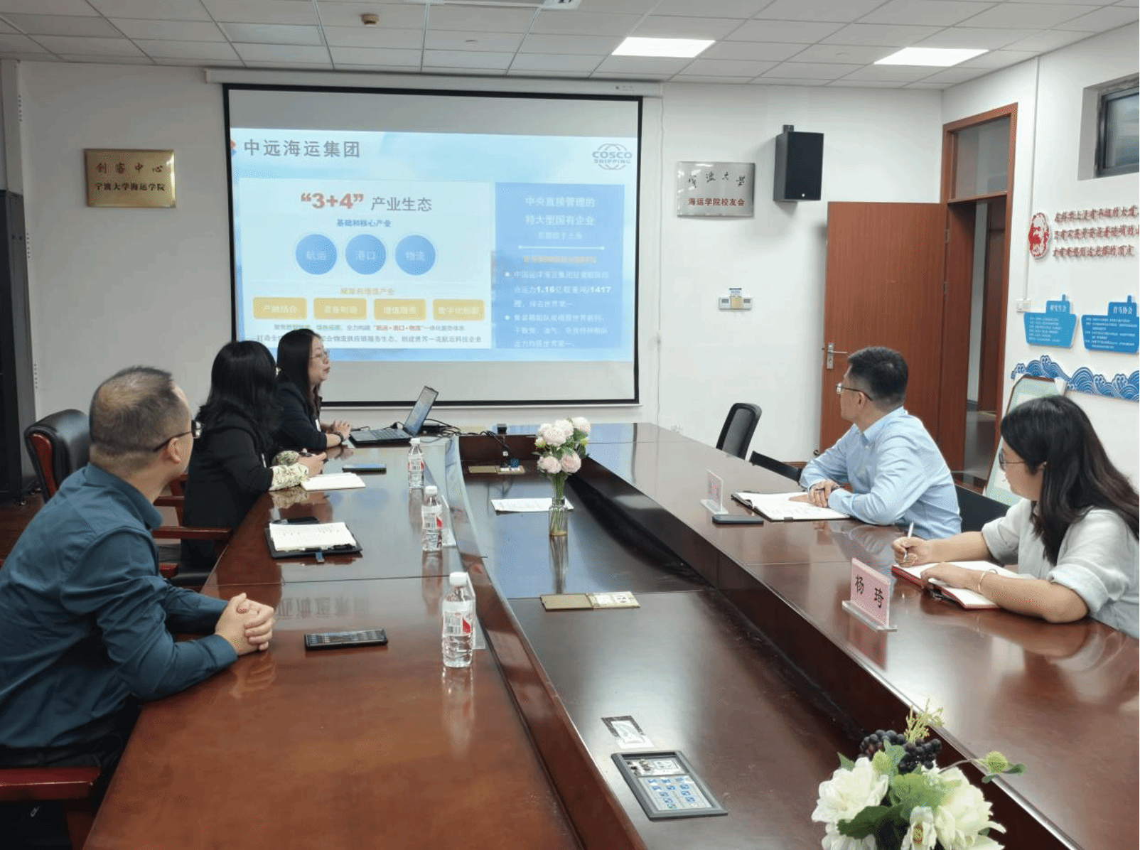 10月22日下午,宁波中远海运集装箱运输有限公司综合管理部总经理张雪琴、综合管理部组织/人力资源室副经理陈秀明,供应链物流部副总经理方李仁(2001级国际航运毕业生)一行到访日韩无码 ,日韩无码 党委副书记张宾、学工办主任杨琦参加交流会。