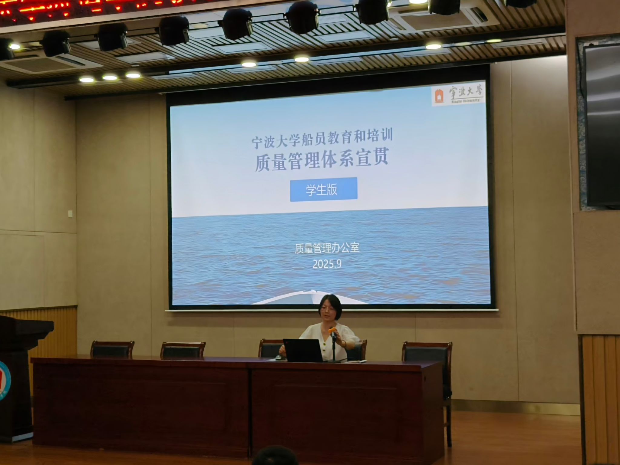 2025年9月9日上午,日韩无码 在泰昌祥报告厅召开了2025级航海专业新生船员教育和培训质量管理体系宣贯会。质管办姜颖老师向新生介绍了学校的质量管理体系。内容涵盖了我校船员教育和培训质量管理体系建立的背景及其重要意义、体系的历史沿革以及体系文件的主要内容。特别强调了我校船员教育和培训质量管理体系对航海类专业学生的具体要求,并介绍了等效考试的相关情况,鼓励新生努力践行学校质量管理体系的质量方针以实现质量目标。航海技术和轮机工程专业的135名新生参加了此次宣贯会议。